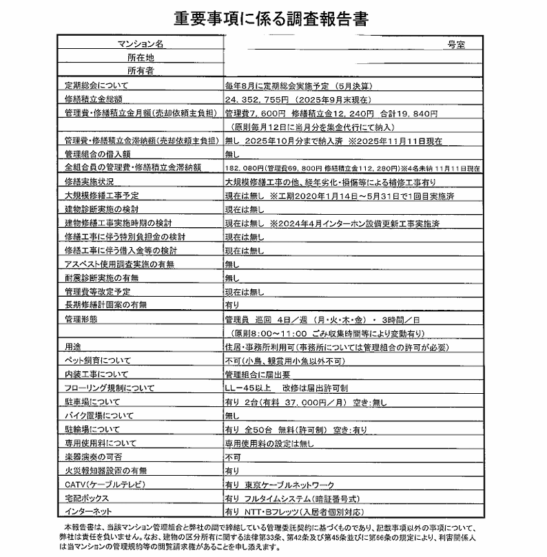 重要事項調査報告書は、契約判断に直結する情報が多く含まれています